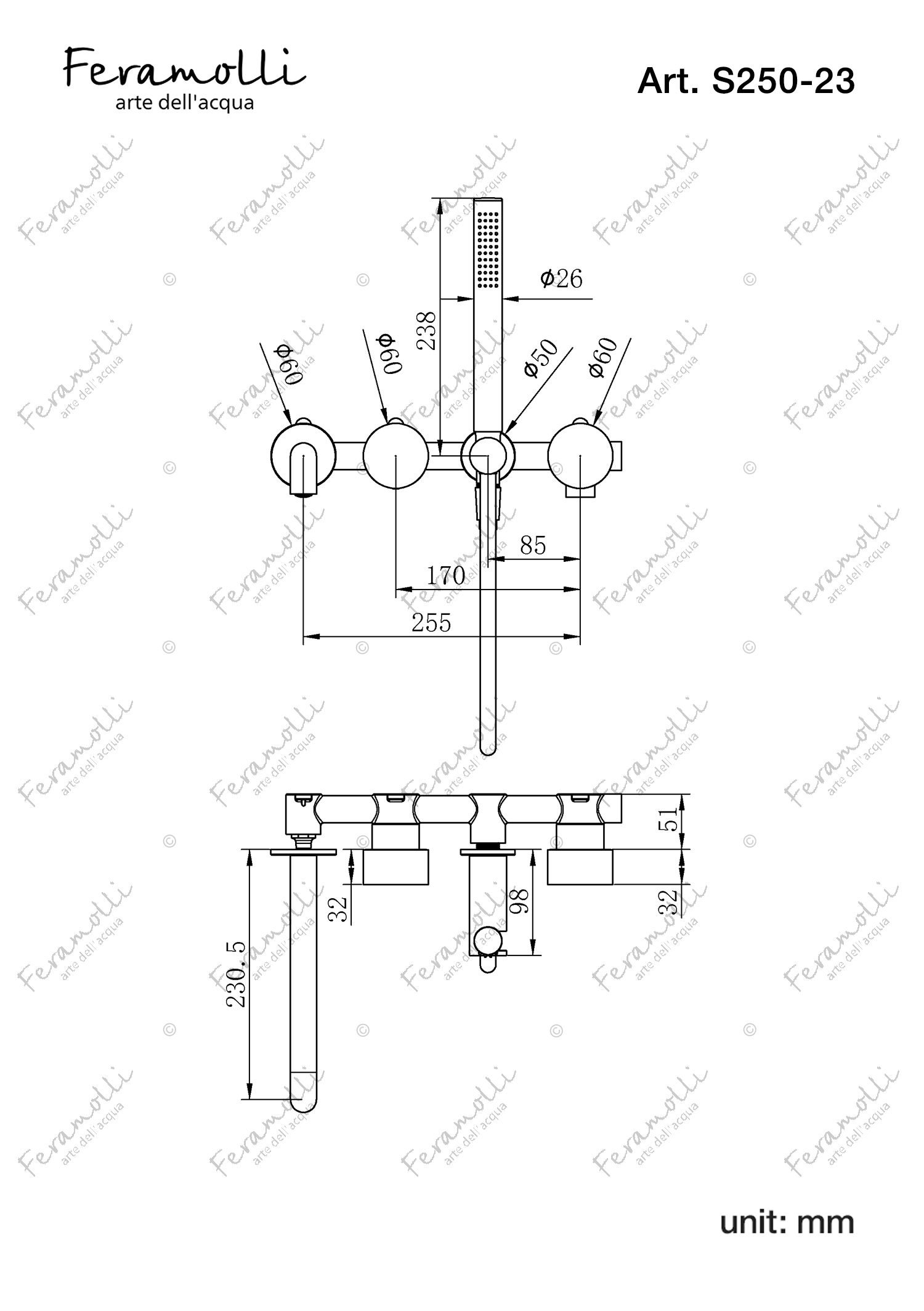 Mitigeur de baignoire et douche encastrable progressif Feramolli S250-23GO avec 4 trous: