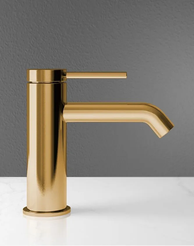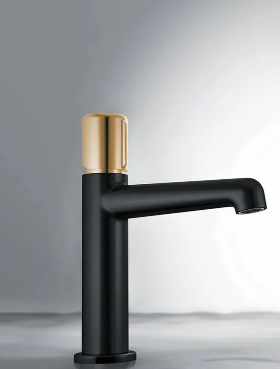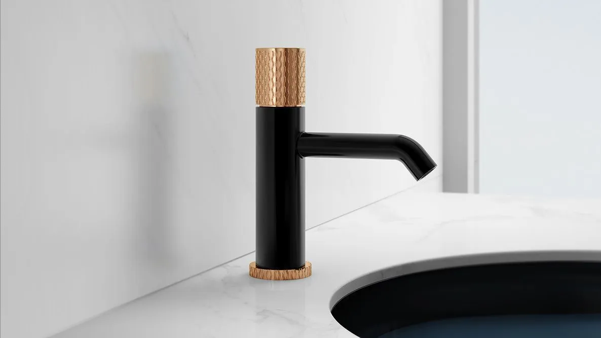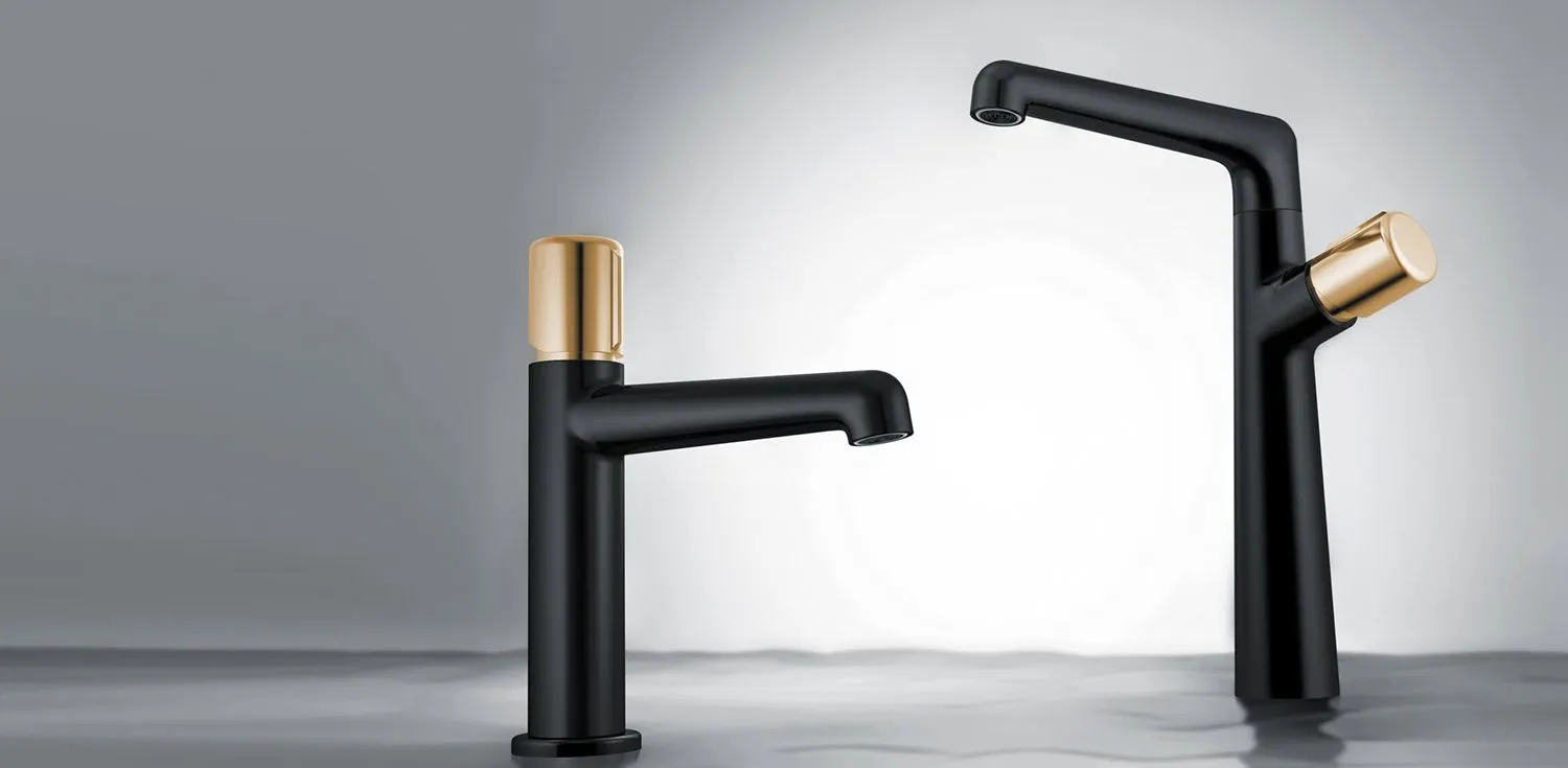 Un'elegante gamma di sanitari dal design geometrico laconico nei toni del nero, dell'oro e del cromo.